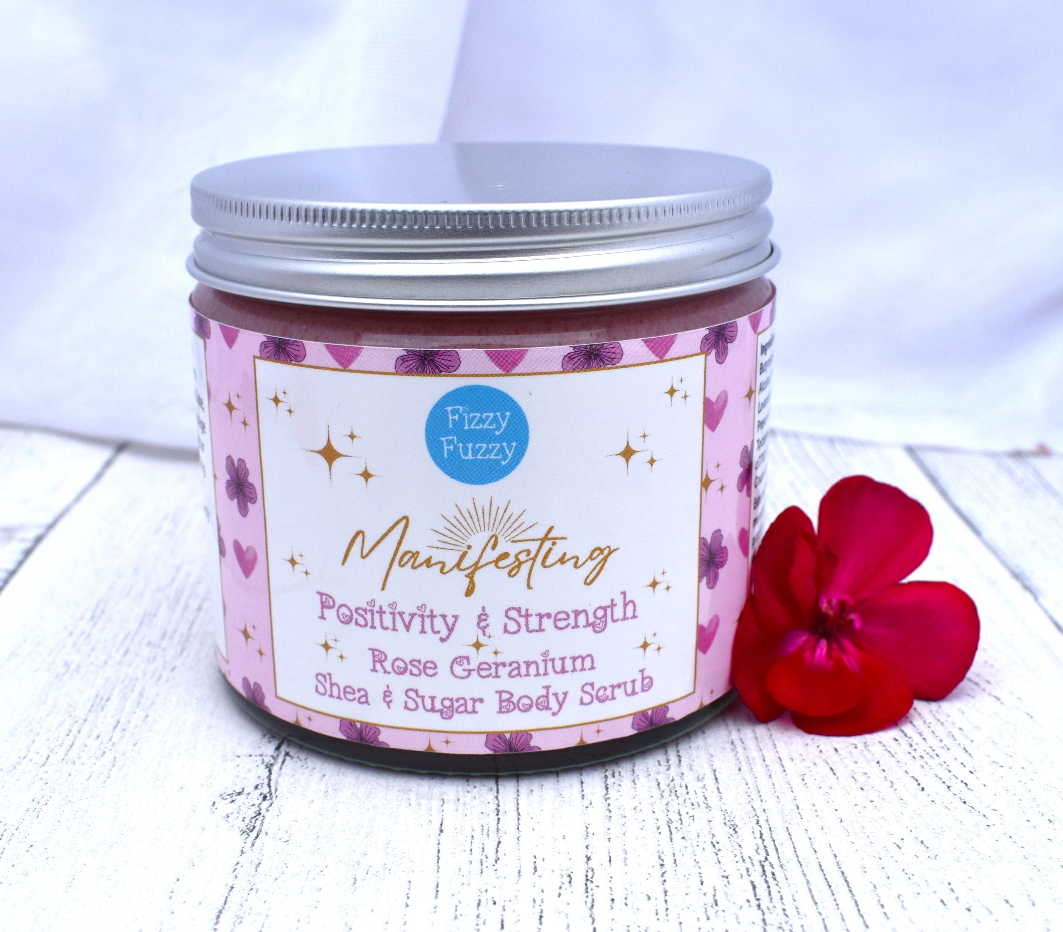 Fizzy Fuzzy Rose Geranium Exfoliating Shea & Sugar Body Scrub | Manifesting Positivity & Strength | Body Polish | Sugar Scrub | Vegan | Plastic Free | Handmade by Fizzy Fuzzy